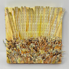 acrylic paint, paper, gold foil, cardboard honeycomb panel on wood,
